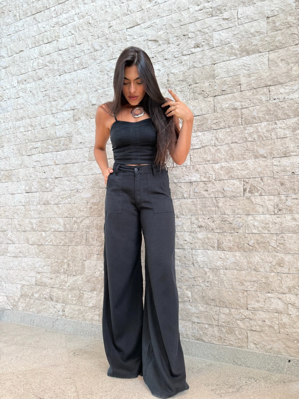 Formado pelo cropped estruturado e pela pantalona de cintura alta, ele é aquele tipo de look que resolve tudo — do dia ao jantar — com zero esforço e muito estilo ✨