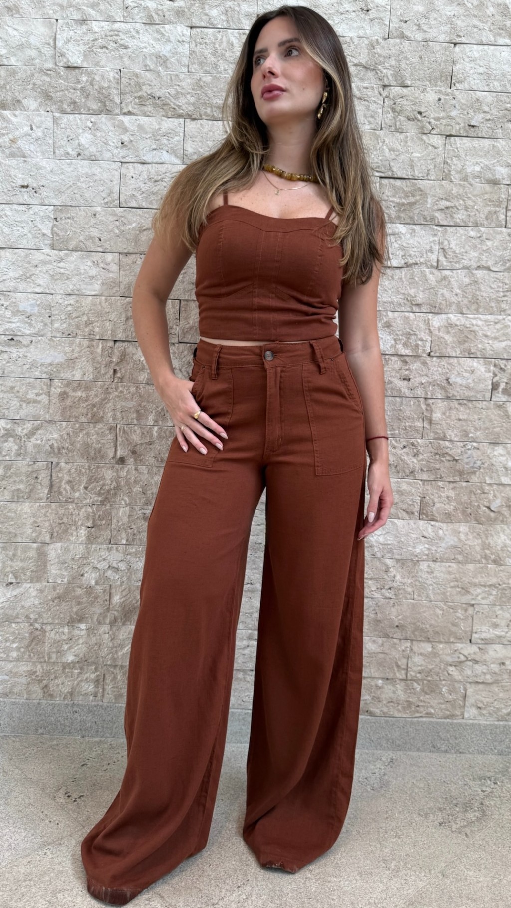 Feito com um blend nobre de fibras naturais, o conjunto garante toque macio, caimento impecável e aquele visual moderno que alonga, afina e valoriza a silhueta.